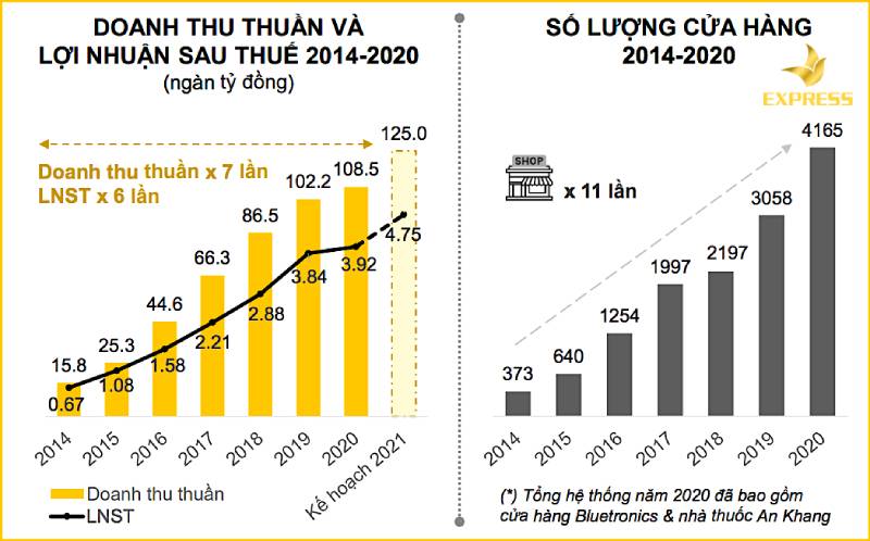 Kết quả doanh thu và tổng số hệ thống cửa hàng của TGDĐ từ nam 2014-2020