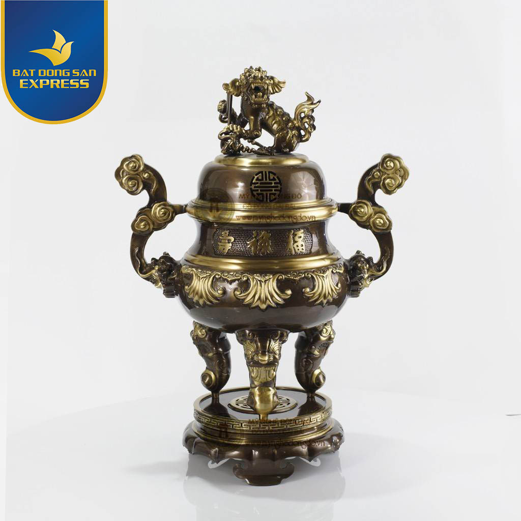 Cách bày trí này giúp bàn thờ của gia chủ thêm phần uy nghiêm và thiêng liêng hơn. Qua sự kết hợp giữa bộ đỉnh đồng và đôi chân nền đều được làm từ đồng vàng đúc nguyên khối, với những vật dụng có sẵn khác (bát hương, bình hoa, mâm quả) cũng góp phần trông bàn thờ đầy đủ hơn và sum vầy hơn trước.