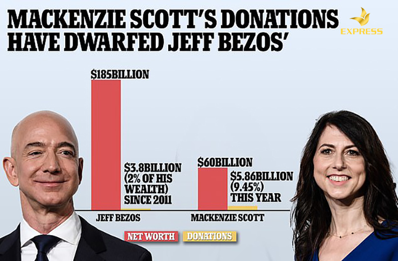 Chỉ trong một năm trôi qua, bà MacKenzie Scott đã dành 9.4% số tài sản của mình để đi thực hiện và làm từ thiện trong khi chồng cũ của bà chỉ dành 2% số tài sản đi quyên góp trong vòng 10 năm qua. Truyền thông và người hâm mộ giờ đây thường gọi bà là nhà từ thiện MacKenzie Scott thay vì là cụm từ "vợ cũ của tỷ phú Amazon".
