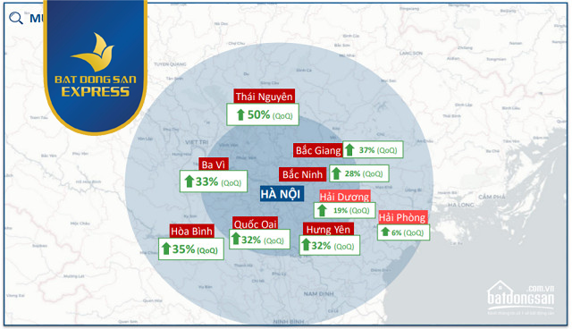 Ở khu vực miền Bắc, giáp ranh Hà Nội, đất của các khu vực như Thái Nguyên, Ba Vì, Bắc Ninh, Hòa Bình, Quốc Oai, Hưng Yên đang tăng giá rất nhanh.