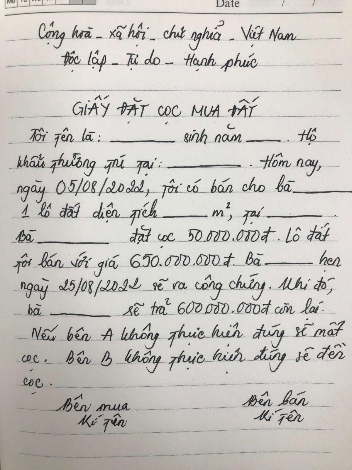 Những thông tin cần có trong giấy đặt cọc mua đất viết tay: