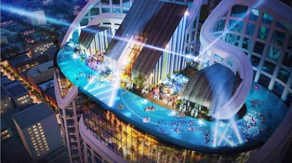 Ông H: Trong quy hoạch thiết kế tổng thể dự án, nhà thầu chúng tôi có thiết kế hồ bơi nước mặn trên tầng cao nhất của tòa căn hộ khách sạn, đây là một điểm nhấn trong thiết kế của toàn dự án. Bể bơi nước mặt được đầu tư tương đối lớn, với phần đáy bể bơi được thiết kế bằng kính trong suốt, đây sẽ là một không gian mang lại cho khách hàng tương lai, du khách nghỉ dưỡng có được một trải nghiêm đầy tuyệt vời. Bể bơi được thiết kế với tầm nhìn đến 360 độ ôm sát theo khung thiết kế của tòa nhà. Cũng chính trên khu vực xây dựng bể bơi, chúng tôi còn có thiết kế hạng mục Skybar đây sẽ là không gian kết hợp giúp mang lại sự nghỉ dưỡng bình yên nhất cho cư dân sau này.