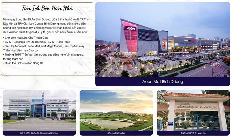 Nằm ngay trung tâm thị xã Thuận An, và giữa 2 thành phố lớn là TP. Thủ Dầu Một – TP.HCM, Icon Central Dĩ An Bình Dương mang đến cho cư dân những tiện nghi hoàn mỹ, chỉ trong vài bước chân bạn sẽ đến với các dịch vụ sang Kể từ đây cư dân đã có cho mình những lựa chọn vững chắc mà không còn băn khoăn gì về dự án.