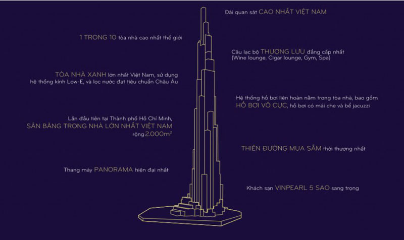 Tòa nhà Landmark 81 với 81 tầng được tạo dáng cao vút vươn lên bầu trời xanh như dấu ấn của cả một thời kỳ thịnh vượng tươi mới.Thể hiện khát vọng vươn ra bên ngoài thế giới của Việt Nam. Được coi là biểu tượng kiến trúc mới ngay tại thành phố năng động nhất Việt Nam, the Landmark 81 chính là trái tim của dự án khu đô thị thu nhỏ Vinhomes Central Park Tan Cang Hồ Chí Minh.