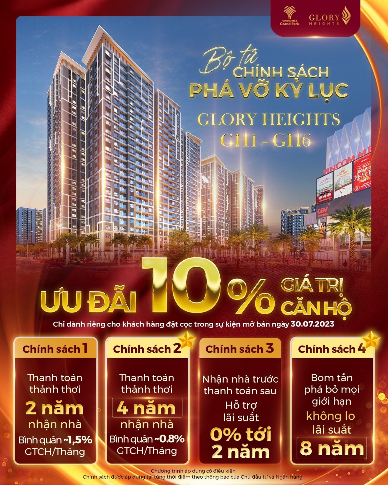 Glory Heights được chủ đầu tư Vinhomes triển khai xây dựng với quy hoạch bài bản, mật độ xây dựng thấp và đặc biệt là toạ lạc tại vị trí toạ độ vàng hiếm có. Glory Heights cung cấp đa dạng loại hình sản phẩm mang lại tiềm năng lớn khi sở hữu để an cư, đầu tư sinh lời.