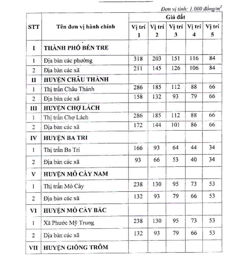 Dưới đây là bảng giá đất ruộng Bến Tre do UBND tỉnh Bến Tre ban hành.