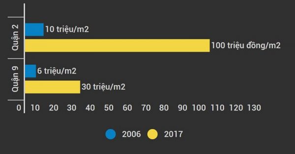 Một nghiên cứu của DKRA cho thấy giá đất tại khu Đông Sài Gòn đã tăng bình quân từ 5 – 10 lần chỉ trong vòng 10 năm. Cụ thể trong năm 2006 thì đất nền của quận 2 có giá 10 triệu đồng/m2 và hiện nay thì ở mức 100 triệu đồng/ m2. Tại quận 9 thì trước đây ở mức 5 – 6 triệu đồng/m2, và giờ là ở ngưỡng 30 triệu đồng/m2.