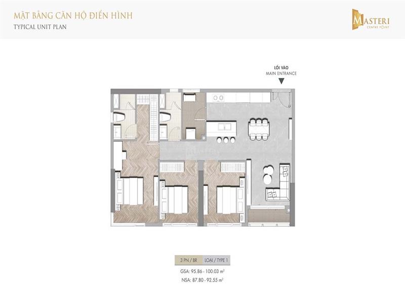 + Căn hộ 3PN: diện tích từ 95,96 – 100,46m2