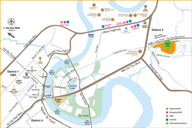 Nếu bạn muốn mua sắm, shopping,giải trí ở những trung tâm thương mại, trung tâm văn hóa, giải trí nhất ở phường An Phú và phường Thảo Điền ở quận 2 thì chỉ cần vài phút di chuyển từ khu đô thị Palm đi theo tuyến đường Xa lộ Hà Nội. Đặc biệt là trong những ngày cuối tuần khi mà có rất nhiều người lựa chọn đi vui chơi sau một tuần dài học tập,làm việc căng thẳng và mệt nhọc.