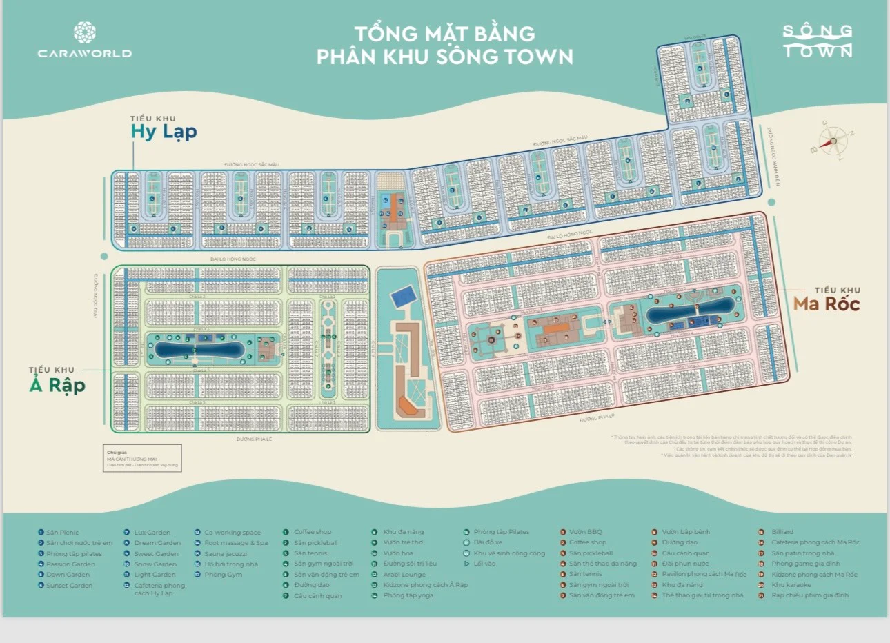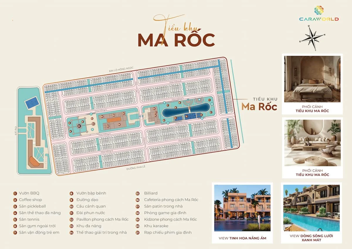 Phân khu Maroc: Cảm hứng thiết kế được lấy từ thành phố Marrakesh nhằm tái hiện hình ảnh độc đáo của sắc đỏ gạch của các công trình mang hơi hướng Hồi giáo. Sự kết hợp giữa không gian sầm uất và kiến trúc mộc tinh tế cũng như giúp kiến tạo nên không gian sống vừa đặc trưng mà cũng như tối giản mọi mặt.