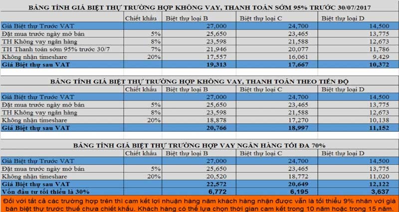 – Nếu nhà đầu tư mua biệt thự nhưng không tham gia chính sách ưu đãi về lãi suất, sẽ được hưởng 8% giá bán biệt thự (chưa tính VAT).