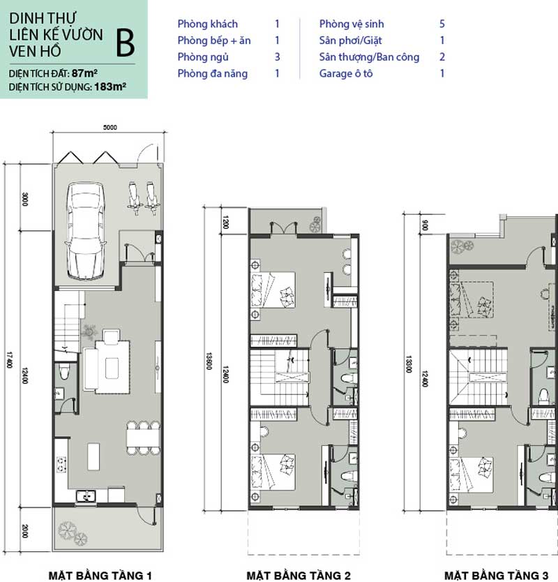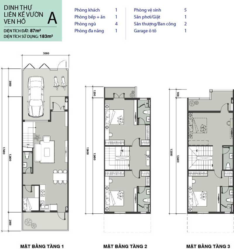 – Nhà phố diện tích 5×17,4m giá bán từ 3.4 tỷ/căn có tổng diện tích sử dụng là 183m2.