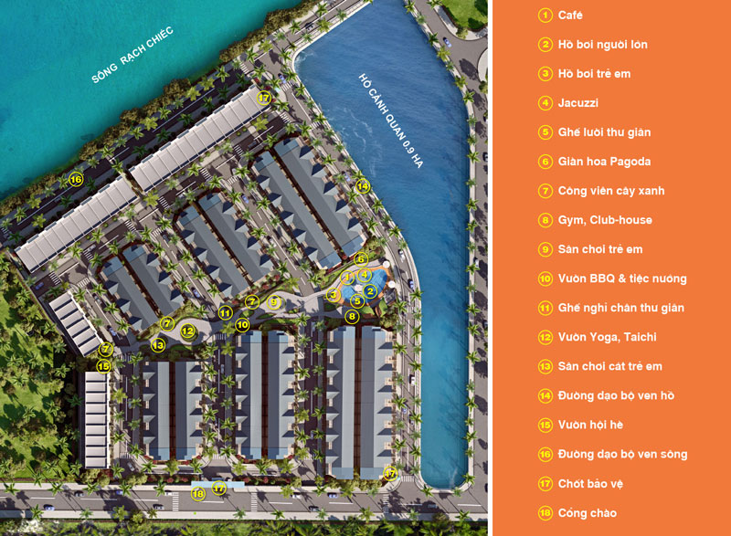 Sơ đồ phân phối vị trí các tiện ích xen kẽ bên trong dự án Valencia Riverside quận 9.
