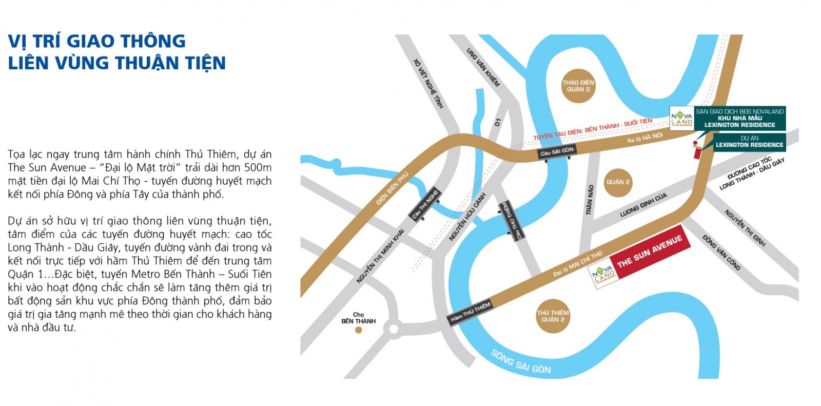 Ngoài ra The Sun Avenue còn sở hữu vị trí liên vùng rất thuận tiện với các tuyến đường huyết mạch như cao tốc Long Thành – Dầu Giây, tuyến tàu điện Metro Bến Thành – Suối Tiên, tuyến đường vành đai trong kết nối trực tiếp với hầm Thủ Thiêm để đến trung tâm quận 1.