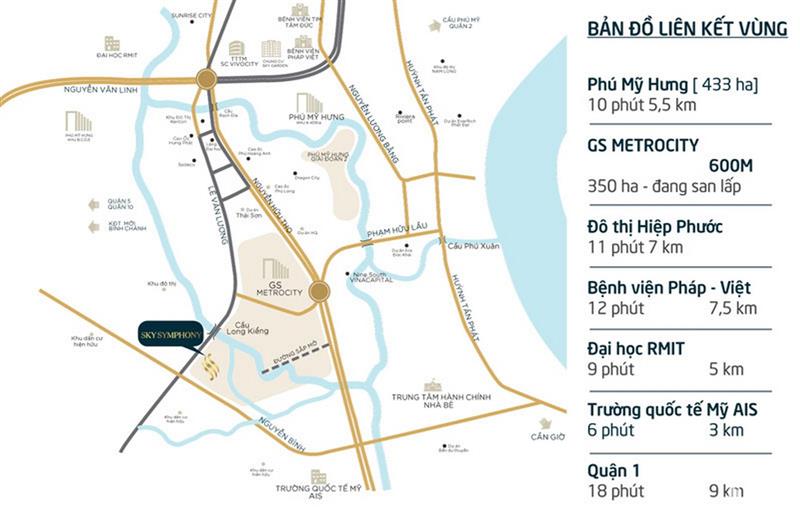 Với vị trí đắc địa như thế, cùng sự bao bọc của hàng loạt các dự án lớn nhỏ xung quanh để tạo nên một liên kết vùng đầy tiềm năng, cư dân căn hộ Sky Symphony dễ dàng kết nối đến các khu độ thị và trung tâm hành chính, tài chính hiện đại nhất thành phố và mang tầm cỡ quốc tế như Phú Mỹ Hưng 1, Phú Mỹ Hưng 2, GS MetroCity, Dragon City, khu đô thị cảng Hiệp Phước.