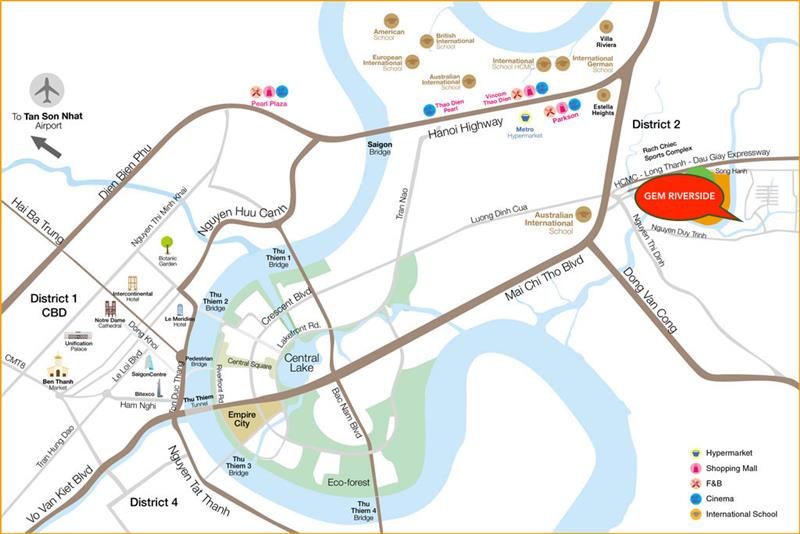 + Từ Gem Riverside bạn cũng chỉ cách The Vista, Parkson, siêu thị Metro Quận 2 khoảng 3.3 km theo đường Mai Chí Thọ.