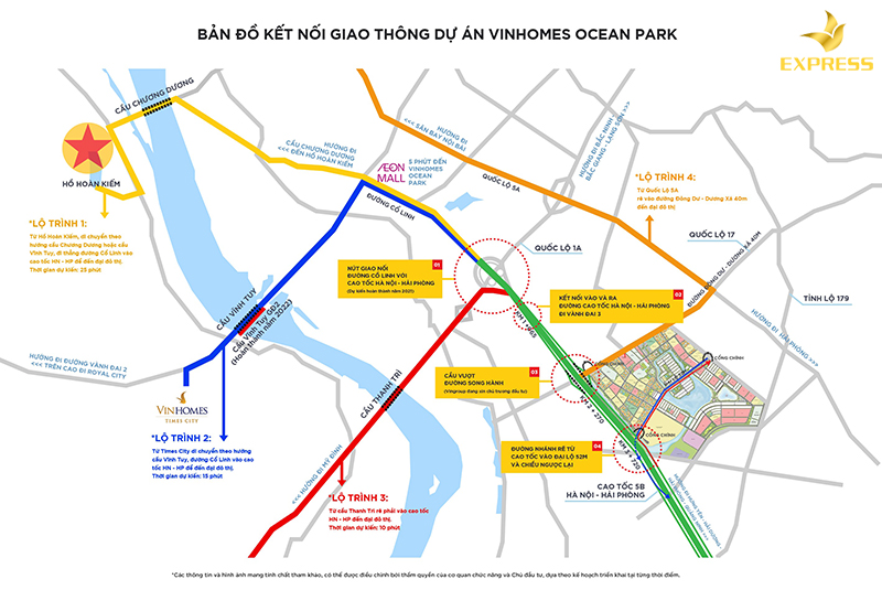 Lộ trình 2: Từ Vinhomes Times City - C. Vĩnh Tuy - Đ.Cổ Linh - Cao tốc Hà Nội - Hải Phòng rồi tới Vinhomes Ocean Park.